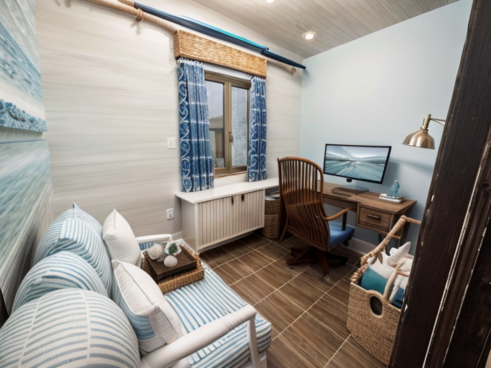 Beach vibes, blue tones, natural materials